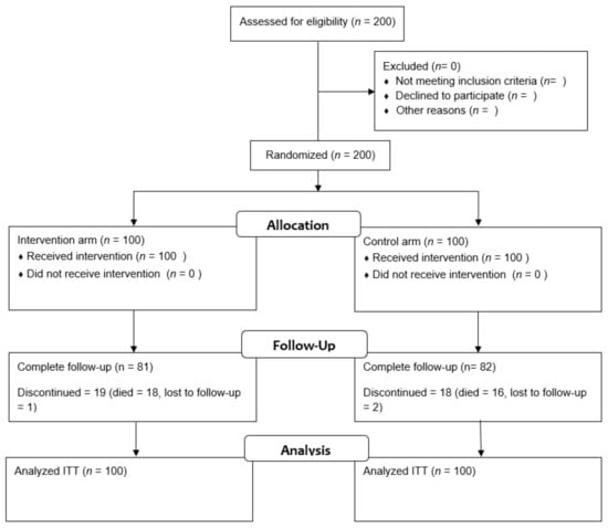From May 2009 to September 2014, 200 patients were enrolled in four cancer centers, of whom 100 were randomly assigned to the intervention arm and 100 to the control arm. During follow-up, 19 patients in the intervention arm and 18 patients in the control arm discontinued the study (Figure 1).