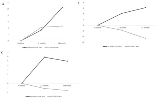 Regarding the secondary endpoint, overall satisfaction and all subscales of satisfaction were not statistically significant at any time and between both arms. However, the mean difference at 2 years between the arms in subscale satisfaction with waiting time met the criterion for a clinically meaningful difference (mean increase of 6.25 (SD = 21.81) in the intervention arm vs. mean decrease of 4.60 (SD = 25.07) in the control arm, and mean difference = +10.85) (Table 4, Figure 2B). Similarly, for subscale satisfaction with an accessibility score, the mean difference between the arms was clinically meaningful (mean increase of 4.92 (SD = 26.50) in the intervention arm vs. mean decrease of 1.60 (SD = 24.53) in the control arm, and mean difference = +6.52 points) (Table 4, Figure 2C).