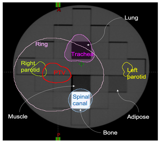 Planning CT of the phantom employed in the study and the countered Regions of Interest (ROIs). Six different ROIs were contoured: planning target volume (PTV), left parotid, right parotid, spinal canal, trachea and RING. Ring structure is the expansion of 3 cm from the PTV and cropped of 0.0 cm from the PTV edge.