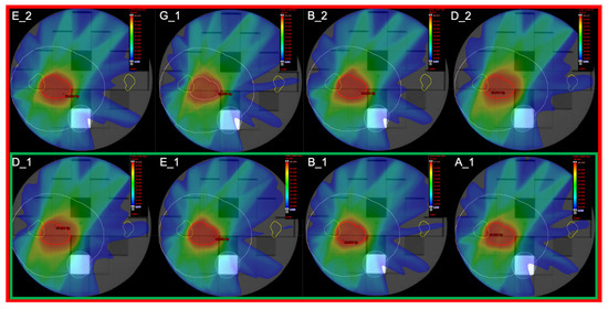 The four IMRT dose distributions included in the reproducibility study (within the green rectangle), and the eight IMRT dose distributions included in the stability study (within the red rectangle).