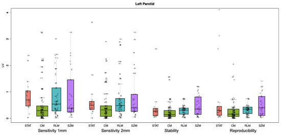 Box plots of the CV values for the sensitivity (1 mm and 2 mm), stability and reproducibility studies, grouped for the four different features’ families (STAT, CM, RLM and GSZ) for the left parotid.