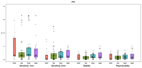 Box plots of the CV values for the sensitivity (1 mm and 2 mm), stability and reproducibility studies grouped for the four different features’ families (STAT, CM, RLM and GSZ) for the PTV.