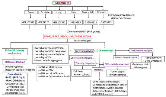 The current global burden of cancer was estimated to be 19.3 million cases in 2020 and is expected to be 28.4 million cases in 2040 [1], a 47% rise from 2020. In line with the previous trend [2,3], the 2020 global cancer statistic report of cancer incidences and mortality indicate that breast (11.7% and 6.9%), lung (11.4% and 18%), colorectal (10.0% and 9.4%), prostate (7.3% and 3.8%), stomach (5.6% and 7.7%), and liver (4.7% and 8.3%) cancers are the most commonly diagnosed and the leading cause of cancer mortality globally [1]. With the exception of prostate and breast cancers, which are sex-specific, the prevalence and mortality rates of these cancers combined were higher in men than in women, at 45.5% and 42.1%, respectively. These six cancers, which constituted 50.7% and 54.1% of the total global cases and cancer deaths, respectively, are the primary focus of the current study and are collectively referred to as hub cancers hereafter. Therefore, it is crucial to identify the promising early diagnostic and prognostic biomarkers that may assist in elucidating the underlying molecular mechanisms of these cancers and simultaneously improve the clinical therapeutics [4].