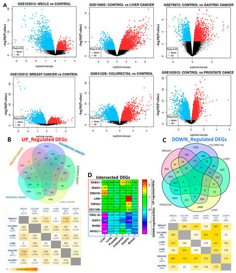 Identification of differentially expressed genes (DEG) between the cancer patients and healthy controls. (A) Volcano plot showing the distribution of DEGs between the cancer patients and healthy controls. The top DEGs are represented satisfying the criteria of logFC value and p < 0.05. The color indicates high expression (red) and low expression (blue). (B) The Venn diagrams of the overlapping up-regulated and (C) down-regulated DEGs in the six cancers. (D) Heat showing the logFC distribution of the 10 overlapping DEGs (6 up-regulated and 4 down-regulated genes) in all six GEO datasets.
