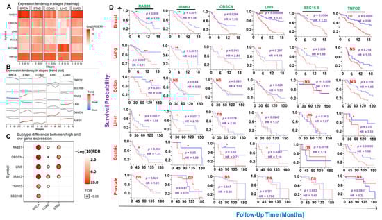 Our differential expression analysis suggested that the expression levels of the hub genes vary with the molecular subtypes of the breast, lung, and stomach cancers and, in most cases, elevates with increased tumor stages of the six cancer hub (Figure 3A–C, Figure S1). Notably, we found that the six hub genes were significantly (all p-value < 0.05) associated with shorter survival duration of the breast cancer cohorts while none of the genes was significantly associated (all p > 0.05) with a prognosis of prostate cancer cohorts (Figure 3D). Furthermore, with the exception of TNPO2 in lung cancer, OBSCN in liver cancer, and SEC16 in gastric and colon cancers, the high expression levels of the hub genes predicted a worse prognosis of the patients. Similarly, we queried the survival differences between the mRNA expression levels of each hub gene across the combined cohorts of the hub cancers and found that higher mRNA expression levels of RAB31, IRAK3, SEC16B, and LIN9 predicted shorter survival durations of the hub cancer cohorts. However, our results predicted that the mRNA expression levels of SEC16B and TNPO2 had no survival significance to the cohorts (Figure S2).