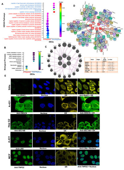 Enrichment and interaction analysis of the DEGs. (A) Bubble plot of KEGG pathway enrichment analysis of DEGs. (B) Bubble plot of GO biological enrichment analysis of DEGs. GO and pathways enrichment is ranked by their p-value. KEGG, Kyoto Encyclopedia of Genes and Genomes. (C) Cycle plot of the DEGs’ (C) gene–gene and (D) protein–protein interaction network (PPI). Node sizes are based on the degree of connectivity of the nodes. (E) Immunofluorescence stain of the subcellular distribution of the hub genes within the nucleus and ER of cancer cells. Gene localizations were detected based on immunofluorescence microscopy of HPA database using the following antibodies: IRAK3 (#HPA043097), OBSCN (#HPA021186), LIN9 (#HPA030241), TNPO2 (#HPA071498), SEC16B (#HPA054292).