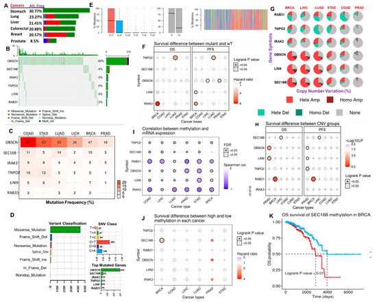 Our analysis of the frequencies of genetic alterations of the hub genes from the TCGA cancer cohorts suggested that the genetic alterations of the hub genes occur at frequencies of 30.77%, 23.27%, 21.41%, 20.88%, 20.57%, and 8.5% in stomach, lung, liver, colorectal, breast, and prostate cancer cohorts, respectively (Figure 5A). Specifically, single nucleotide variation (SNV) of OBSCN is the most frequently predicted gene alteration, while SNV of SEC16B, IRAK3, TNPO2, LIN9, and RAB31 constituted 9%, 5%, 5%, 4%, and 2% of genetic alterations in the TCGA cohort of the hub cancers (Figure 5B–D). In addition, our results also suggested that the missense mutation is the most frequent effective mutation of the hub genes, having the occurrence counts of >70%, while other effective mutations including the nonsense, frame_shift_ins, splice_site, frame_shift_del, in_frame_del, and in_frame_ins constituted a smaller proportion of the SNV of the gene hub in the TCGA samples of the hub cancers (Figure 4D, Table S1). The majority of the mutations were predicted to be C > T and T > C transitioned, and C > G and C > A transversion (Figure 5E). However, our survival analysis indicated that SNV of TNPO2 and IRAK3 are associated with a worse prognosis of LUAD and BRCA cohorts. OBSCN predicted a poor prognosis of LIHC and PRAD while LIN is associated with poor survival of BRCA cohorts (Figure 5F). Our correlation analysis also suggested that the copy number alterations of the hub genes occur most frequently in BRCA, LIHC, and LUAD, while the least CNA occurs in PRAD. These CNA were mostly heterozygous amplification and heterozygous deletion. Our results predicted distinct types of CNA of the hub genes; OBSCN, LIN9, and SEC16B were predicted to exhibit amplification (heterozygous and homozygous) type of CNA while RAB31, TNPO2, and IRAK3 were predicted to exhibit heterozygous deletion and amplification types of CNA (Figure 5G). Despite the low frequencies of CNV of the hub genes in PRAD, survival analysis predicted a shorter survival duration for those cohorts having CNV of OBSCN and LIN9 (Figure 5H). CNA of RAB31 and SEC16B predicted poor prognosis of BRCA and LICH, respectively. With the exception of SEC16B in BRCA, the methylation levels of the six hub genes were in negative correlation (all cor < 0 and all p < 0.05) with the mRNA expression levels in the six cancer types (Figure 5I). Surprisingly, only the methylation of SEC116B in BRCA predicted a significant (p < 0.05) poor prognosis of the cohorts (Figure 5J,K).