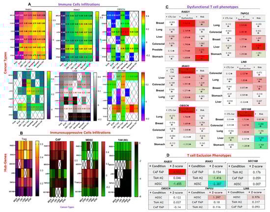 The hub genes expression correlate with the gene expression profiles suggestive of tumor immune evasion. Heat map showing the correlation between the expression levels of the six hub genes with the levels of gene expression suggestive of (A) six immune cells (B cell, CD8+ T Cell, CD4+ T Cell, macrophage, neutrophil and dendritic) infiltration, and (B) four immunosuppressive cell types, myeloid-derived suppressor cell (MDSCs), cancer-associated fibroblasts (CAF), tumor-associated macrophages (M2-TAM), and regulatory T cell (Treg) infiltration across the hub cancers. (C) Heat map showing the correlation between the expression levels of the six hub genes with the level of active cytotoxic lymphocyte and dysfunctional T cell phenotypes of the six hub cancer cohorts. (D) Summary heat map of the association between the gene expression levels and T cell exclusion phenotypes using data from 3 immunosuppressive cells. Z-score (T cell exclusion score); The interaction coefficient “(d)” of the gene divided by its standard error. Condition; T cell exclusion signature.