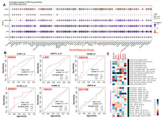 The results of the present study suggested a significant correlation between the mRNA expression levels of the hub genes and IC50 values of 70 small molecules. Interestingly, high mRNA expression levels of RAB31 and SEC16B predicted cancer cell lines resistant to 62 and 17 small molecule anticancer drugs, respectively. The mRNA expression levels of OBSCN and IRAK3 were associated with resistance to vemurafenib, while the IC50 concentrations of other drugs correlate negatively with the expression levels of the hub genes in the cancer cell lines (Figure 7A). In addition, we link the expression levels of the hub genes and response to anti-cancer therapy using transcriptome-level data of the cancer patients. Interestingly, our results suggested that IRAK3, RAB31, LIN9, and OBSCN has strong prognostic power with estimated AUC values of 0.695, 0.644, 0.689, and 0.79, respectively. The expression level of TNPO2 predicted week prognostic power for clinical utility (AUC = 0.546) while the expression levels of SEC16B predicted no significant association with chemotherapy sensitivity of the hub cancers (Figure 7B). Finally, we access the gene prioritization of hub genes in order to predict a generalized role of each gene’s associations with ICB response outcome and phenotypes in genetic screens (CRISPR screens). Our results suggested that high gene expression levels of the hub genes are associated with resistance to worse patient outcomes to PD1, CTL4A, and PDL1 immunotherapies in the immune checkpoint blockage datasets (Figure 7C, upper panel). The prioritization of the hub genes in the gene expression profiles suggestive of tumor immune evasion and immunotherapy response occurs in the order of RAB31 > TNPO2 > OBSCN > IRAK3 > LIN9 > SEC16B (Figure 7C).