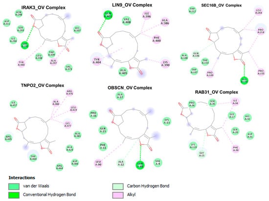 Two dimensional (2D) representation of the docking profile of ovatodiolide (OV) with the crystal structures of the cancer hub genes RAB31 (PDB:2fg5), IRAK3 (PDB:6ruu), OBSCN (PDB:2e01), LIN9 (PDB:6c48), TNPO2 (PDB:2z5j), and SEC16B (PDB:3mzk). Each complex represents the interaction of the best docking pose between the receptor and the ligand.