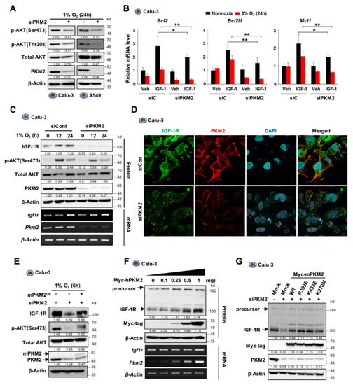 PKM2 deficiency reduces AKT phosphorylation by suppressing IGF-1R expression in hypoxic conditions. (A) Abundance of AKT and phospho-AKT proteins in Calu-3 cells transfected with control siRNA or PKM2 siRNA under hypoxic condition (1% O2) for 24 h. (B) The levels of mRNA expression of anti-apoptotic genes in Calu-3 cells transfected with control siRNA or PKM2 siRNA under normoxic or hypoxic conditions (3% O2) for 24 h, normalized to β-actin mRNA. IGF-1 (200 ng/mL) was treated for 24 h. Values of graph were presented as mean ± SD. Statistical significance was measured using one-way ANOVA with the Tukey post hoc test. * p < 0.05, ** p < 0.01. (C) (Upper panel) Protein abundance of IGF-1R, p-AKT(S473), PMK2, and AKT1/2; and (lower panel) mRNA expression for IGF-1R and PKM2 in Calu-3 cells transiently transfected with siPKM2 under hypoxic conditions (1% O2) for indicated times. (D) Confocal microscopic images of endogenous IGF-1R and PKM2 detected by immunofluorescence in Calu-3 cells transfected with PKM2 siRNA under hypoxic condition (1% O2) for 6 h. (E) IGF-1R and p-AKT(S473) protein abundance in Calu-3 cells transiently transfected with siPKM2 and/or Myc-tagged mouse PKM2 gene (Myc-mPKM2). (F) Protein and mRNA levels of IGF-1R in Calu-3 cells transiently transfected with different doses of Myc-tagged human PKM2 gene (Myc-hPKM2). (G) IGF-1R protein abundance in Calu-3 cells transiently transfected with siPKM2 and/or Myc-tagged mutant mPKM2 genes. β-Actin was used as the loading control in (A,C,E–G).
