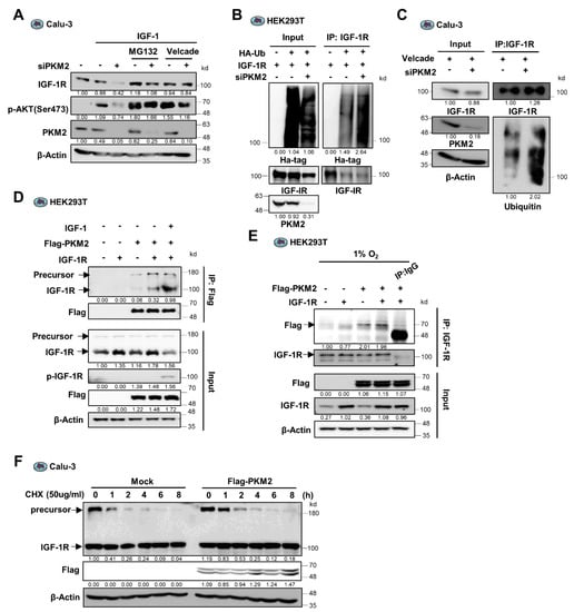 PKM2 physically binds to IGF-1R and regulates its stability via the ubiquitin-proteasome system. (A) IGF-1R and p-Ser473-AKT protein abundance in siPKM2-expressing Calu-3 cells pre-treated with the proteasome inhibitors, MG132 (10 μM) or Velcade (10 μM). IGF-1 (200 ng/mL) was treated for 12 h. (B,C) Ubiquitinated IGF-1R abundance in anti-IGF-1R immunoprecipitates from the extracts of siPKM2-transfected 293 T or Calu-3 cells exogenously expressing IGF-1R and HA-tagged ubiquitin, (B) or not (C). (D) Abundance of IGF-1R precursor and mature proteins in the anti-Flag immunoprecipitates from HEK293T cells exogenously expressing IGF-1R and Flag-PKM2. IGF-1 (200 ng/mL) was treated for 12 h. (E) PKM2 protein abundance in anti-IGF-1R immunoprecipitates from HEK293T cells expressing Flag-PKM2 and IGF-1R under hypoxic condition (1% O2) for 24 h. Normal mouse IgG was used as the negative control. (F) Determination of precursor and mature IGF-1R protein stability in Flag-PKM2 expressing Calu-3 cells following CHX (50 μg/mL) treatment for the indicated time. β-Actin was used as the loading control in (A,C–F).