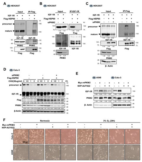 PKM2 regulates the IGF-1R/HSP90 interaction contributing to cancer cell viability. (A) Identification of the tertiary complex of IGF-1R, PKM2, and HSP90 proteins in HEK293T cells exogenously transfected with IGF-1R, Myc-PKM2, and Flag-HSP90 genes, as indicated. (B) Flag-HSP90 protein abundance in IGF-1R immunoprecipitates from HEK293T cells transfected with control siRNA or PKM2 siRNA. Each cell was also exogenously transfected with IGF-1R and Flag-HSP90 cDNAs, as indicated. (C) Abundance of IGF-1R precursor and mature proteins present in Flag-HSP90 immunoprecipitates from HEK293T cells transfected with control siRNA or PKM2 siRNA. Each cell was also exogenously transfected with IGF-1R and Flag-HSP90 cDNAs, as indicated. (D) Precursor and mature IGF-1R protein stability assessed following treatment with CHX (50 ug/mL) for the indicated time in Calu-3 cells expressing Flag-HSP90 and/or siPKM2. (E) Determination of the effect of NVP-AUY922 (500 nM) treatment on IGF-1R protein abundance in A549 and Calu-3 cells transfected with an expression plasmid for PKM2 or mock vector. (F) Determination of the effect of NVP-AUY922 (500 nM) treatment on the viability of Mock or Myc-mPKM2 expressing Calu-3 and A549 cells, cultured under normoxic or hypoxic conditions (3% O2) for 24 h. The images were obtained using Olympus microscope IX71 with phase contrast. β-Actin was used as the loading control in (C–E).