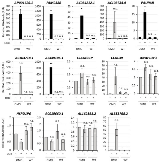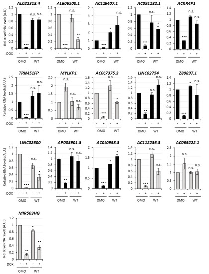 Validation of the MYC-dependent lncRNAs downregulated by OMOMYC in D283 MED cells. qRT-PCR analysis in D283-OMO cells 72 h-treated with DOX (OMO+) of the most expressed and downregulated lncRNAs, according to the RNA-Seq. Among the 20 top hits from the Dataset S3 16 RNAs were successfully detected included in the figure. Expression levels were compared to untreated D283-OMO (OMO−) as control, set as 1. Parallel analysis in untreated (WT−) vs. treated WT (WT+) D283 MED cells revealed possible unspecific effects of DOX on lncRNA expression. Validated candidates (9 lncRNAs) are indicated by black histograms, non-validated candidates (7 lncRNAs) are reported in grey. Data (means ± SEM) are expressed in arbitrary units and are relative to ATP5O mRNA levels. N = 3, * p ≤ 0.05, ** p ≤ 0.01, *** p ≤ 0.001 (two- tailed Student’s t-test).