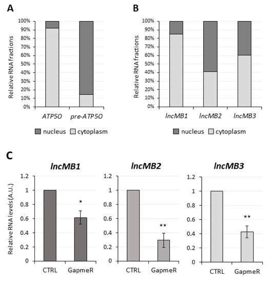 Subcellular localization is a parameter to be considered for inferring lncRNA biological functions. Therefore, the distribution of lncMB1, lncMB2 and lncMB3 was assessed in DOX-untreated D283-OMO cells by nucleus-cytoplasm fractionation and following qRT-PCR analysis (Figure 7). Compared to fractionation controls (Figure 7A), 85% of lncMB1 transcript was localized in the cytoplasm (Figure 7B). Conversely, lncMB2 and lncMB3 were almost equally distributed between the nuclear and cytoplasmic compartments, the former being slightly more abundant in the nucleus, the latter in the cytoplasm (Figure 7B).