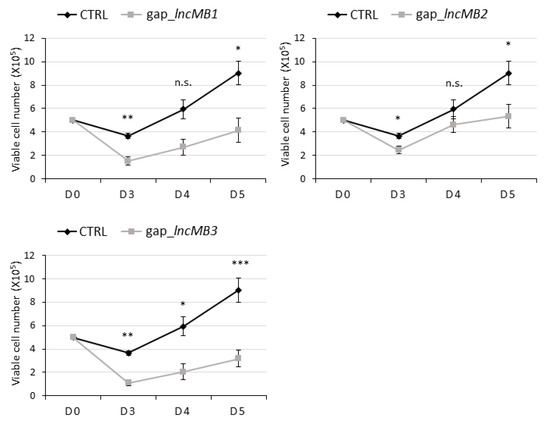 LncMB1, lncMB2 and lncMB3 functional involvement in G3 MB tumorigenesis was investigated in DOX-untreated D283-OMO cells through LNA GapmeR-mediated silencing [37,38]. Compared to transfections of scrambled LNA GapmeRs, used as negative control, the specific targeting of lncMB1, lncMB2 and lncMB3 significantly downregulated their expression by 40%, 70% and 60%, respectively (Figure 7C). In these conditions, we registered an alteration of cell morphology, i.e., a reduction of the number and size of the multicell aggregates typically generated by growing D283 MED cells (Figure S6). Interestingly, also the total number of both adherent and floating cell drastically decreased upon lncRNA depletion, as quantitatively assessed by evaluating the number of viable DOX-untreated D283-OMO cells at specific time points after LNA Gapmer delivery (Figure 8). We found that knockdown of lncMB1 and lncMB2 led to a reduction of viable cell numbers by about 50% and 40%, respectively, at day 5 (D5). More prominent was the outcome of lncMB3 depletion, which caused a three-fold decrease of viable cell numbers at the same time point.