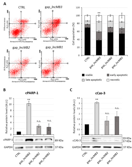 To further corroborate our results, the levels of cleaved Poly (ADP-ribose) polymerase 1 (cPARP-1) protein, a well-characterized product of caspase activity [40,41], were analyzed by Western blot upon lncRNA depletion. Compared to control cells, an increase by about ten-folds of cPARP-1 level was obtained upon lncMB3 targeting (Figure 10B); no significant variation was detected upon lncMB1 and lncMB2 silencing, suggesting that lncMB3 depletion specifically triggers caspase-dependent apoptosis. This result was strengthened by the analysis of Caspase-3, that is mainly responsible for PARP cleavage during the apoptotic process. Indeed, the active subunit of Caspase-3 (cCas-3) was increased by 3-fold compared to the control upon lncMB3 knockdown (Figure 10C), thus confirming that lncMB3 depletion triggers a caspase-dependent apoptosis in MB cells [42].