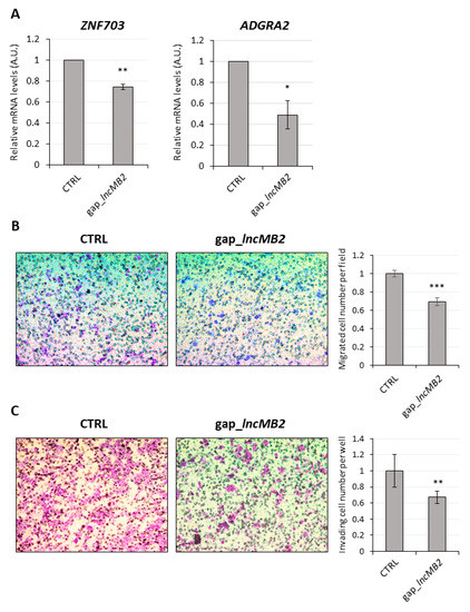 Next, we addressed the function of lncMB2 and lncMB1. As stated before, lncMB2 is a predominantly nuclear transcript, whose proximal genes ZNF703 and ADGRA2, mapping about 360 Kb and 460 Kb apart from lncMB2 locus (AC091182.1), respectively (Figure S7), are both related to cancer [43,44]. qRT-PCR analysis of their expression highlighted a down-regulation by about 30% of ZNF703 RNA levels upon lncMB2 silencing, compared to scramble-transfected D283 MED cells (Figure 11A, left panel). In the same conditions, we found a 50% reduction of ADGRA2 expression (Figure 11A, right panel). These results indicate that lncMB2 acts as a positive regulator of the oncogene ZNF703 and the CNS angiogenesis regulator ADGRA2. Since ZNF703 activity as a transcriptional corepressor is associated with cell migration and adhesion [43] and given that G3 MB shows the highest metastasis rate among MB subgroups [5,7,45,46], we measured migration and invasion capacity of DOX-untreated D283-OMO cells by a trans-well assay. Visualization and count of crystal violet-stained cells highlighted a significant decrement of both migration (Figure 11B) and invasion (Figure 11C) by about 30% upon lncMB2 knockdown with respect to control. Our data prove that lncMB2 favors MB cell mobility, suggesting a possible role in promoting metastatic behaviors.