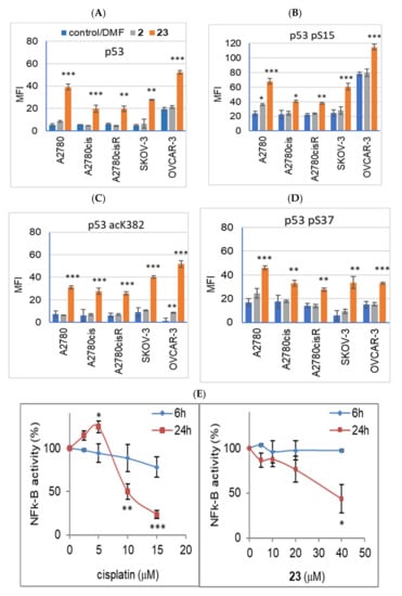 The effect of compound 23 was dose-dependent, that is, increasing doses of compound 23 (10–40 μM, 24 h) induced an apparent increase in p53 expression in A2780, SKOV-3, and OVCAR-3 cells, whereas compound 2 was not effective (Figure S6). The expression level of phosphorylated p53 (Ser15) also increased in a dose-dependent manner in A2780 and SKOV-3 cell lines under the influence of increasing doses of compound 23 (Figure S6). The results for compound 23 (effective) and compound 2 (ineffective), expressed as fold change (treated/control), are summarized in Table S1 and Figure S7 (Supplementary Materials).