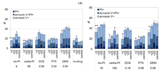 The percentage of necrotic cells (PI+) and cells in late apoptosis (PI+/annexin V+) increased twofold in “+25 cells” compared to that of the cisplatin and carboplatin-treated control, while the percentage of early apoptosis cells remained unchanged (Figure 9A,B). An increase in late apoptosis cells was also found in the control “+23 cells” not treated with cisplatin, carboplatin, DOX, PTX, and GEM (“no drug”, Figure 9A). Detailed analysis for apoptotic and necrotic cells is presented in the Supplementary Materials (Figure S8A,B, respectively, Supplementary Materials).