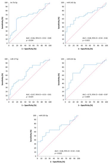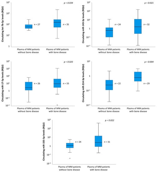 The analysis of the obtained data unveiled five circulating miRNAs, namely, let-7b-5p (p = 0.034), miR-143-3p (p = 0.021), miR-17-5p (p = 0.025), miR-214-3p (p = 0.004), and miR-335-5p (p = 0.022), that were significantly higher in the plasma samples of MMBD patients than in the plasma samples of non-MMBD patients (Figure 1) and those of normal controls (Table S1).