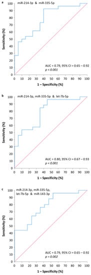 Receiver operating characteristic (ROC) curves for combinatorial models of (a) miR-214-3p and miR-335-5p; (b) miR-214-3p, miR-335-5p and let-7b-5p; (c) miR-214-3p, miR-335-5p, let-7b-5p, and miR-143-3p. The combination of miR-214-3p, miR-335-5p, and let-7b-5p into a standalone model constitutes the most prominent predictor of MMBD in MM patients.