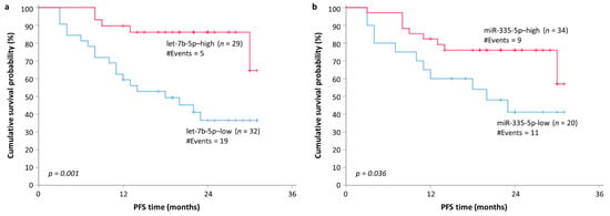 Kaplan–Meier survival curves for progression-free survival (PFS) of MM patients. Reduced plasma levels of (a) let-7b-5p and (b) miR-335-5p were shown as potentially unfavorable molecular markers of prognosis in MM.