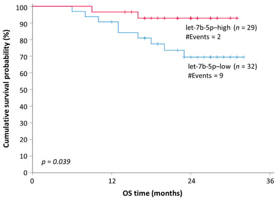 Kaplan–Meier survival curves for overall survival (OS) of MM patients. Reduced plasma levels of let-7b-5p were shown as potentially unfavorable molecular markers of prognosis in MM.