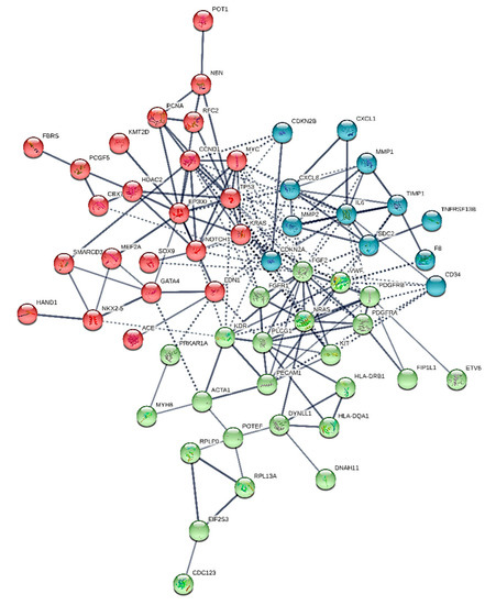 All six interactions networks are presented in 3 basic color-specified units/clusters. Nodes in a given cluster are most closely connected to those nodes of the corresponding cluster, as compared to the other two clusters. Nodes in the same cluster module can be associated with similar/common biological functions. This information could be expanded to more complicated enriched clusters that represent cardiac sarcoma-related biological processes, in the future.