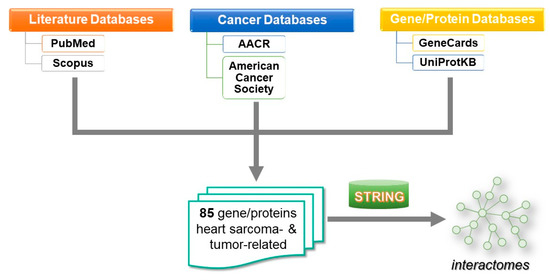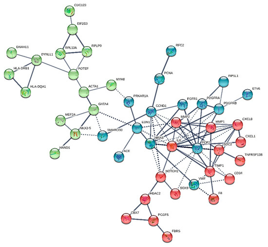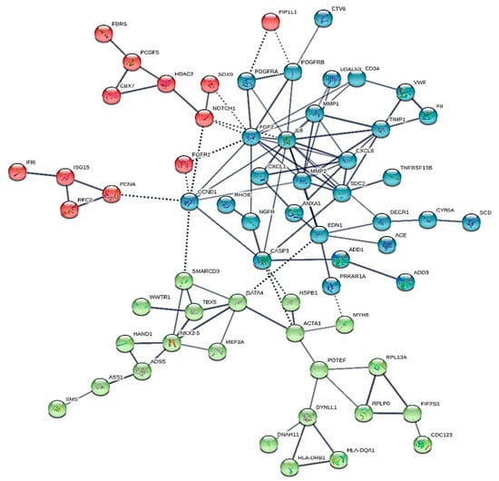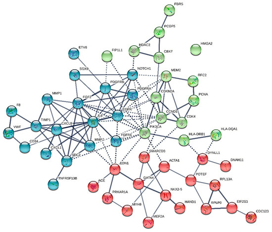 An extensive search in literature (PUBMED, Scopus), databases (GeneCards, UniProt) and cancer official sites (https://www.aacr.org/, accessed on 31 March 2021, https://www.cancer.org/, accessed on 31 March 2021), was conducted in the period December 2018–January 2021, revealing 85 gene/protein heart sarcomas-related and tumor-related targets. The interactions among gene/gene products were studied through STRING v10 [62]. A relative high confidence interaction score of 0.7–0.97 was opted so as to extract relevant information from multiple and diverse sources, avoiding at the same time the inclusion of rather erroneous interactions (e.g., false positives). The average degree of connectivity (i.e., mean number of connections of a given node to its immediate neighbors) and k-means clustering in the constructed networks were computed with the usage of algorithms implemented in the STRING database. The nodes in the network were partitioned into three clusters, based on the shortest path (distance) between two given nodes. Intra-cluster edges are represented by solid lines, whereas inter-cluster edges are denoted by dashed lines.
