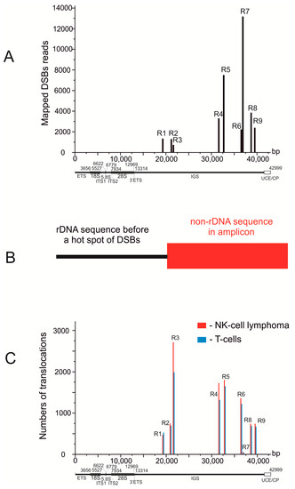 To search for rDNA-mediated translocations, we used the dataset with accession EGAD00001003271, which contains the whole genome sequence (WGS) of T cells and NK-cell lymphoma, from the European Genome-phenome Archive. The dataset contains 102 paired samples from tumor (NK cells) and normal (T cells) cells from the same individual. The details of the search are described in the Section 2. Figure 1A shows that Pleaides (R1–R9) are located exclusively in the intergenic spacer (IGS) of rDNA units [5]. WGS amplicons that were initially used for paired-end sequencing were selected as they contain the rDNA anchor sequences. The anchors were selected using the alignments of DSB reads along the rDNA sequence (for details see the Supplementary Information in [5]). The anchors correspond to rDNA stretches located about 50 bp before the Pleaides on one side of each selected paired-ends read (Table 1, Figure 1B). Then, these amplicons were analyzed from other sides, and if non-rDNA stretches were detected there, the corresponding amplicons were considered as representing the translocation events. Amplicons possessing rDNA sequences at both ends correspond to the rDNA units.