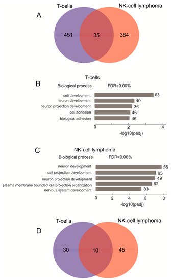 Analysis of genes located at translocation sites in T cells and NK-cell lymphomas. (A) a Venn diagram showing the intersections between genes at translocation sites in T cells and NK-cell lymphomas. Table S2 shows the list of overlapping genes. (B) the top five Gene Ontology biological process associations of genes shown in (A) that correspond to the affected genes in T cells. The values to the right of the bars show the number of genes associated with a process. Table S3 shows the results of the corresponding GO search. (C) the top five Gene Ontology biological process associations of genes shown in (A) that correspond to the affected genes in NK-cell lymphomas. The values to the right of the bars show the number of genes associated with a process. Table S4 shows the results of the corresponding GO search. (D) a Venn diagram showing the intersections between genes corresponding to GO item GO:0048666 (neuron development) at translocation sites in T cells and NK-cell lymphomas.
