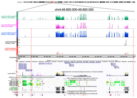 Translocation sites in both normal T cells and in NK-cell lymphomas coincide with and correspond to the hot spots of rDNA contacts in three human cell lines of different origin. The distribution of rDNA-contacting sites in K562 cells, HEK293T, and in hESM01 cells [24] in the pericentromeric region of chr4 are shown as in IGB Browser (hg19). The translocation sites detected in 102 samples, each containing amplicons from T cells and NK-cell lymphomas from the same individual, are shown. The distribution of UCSC genes, layered H3K27ac marks, genome segmentation from ENCODE, histone modifications, nucleosome position, and CpG methylation inside of a 1-Mb region of chr4 are shown as in the UCSC Browser (hg19).