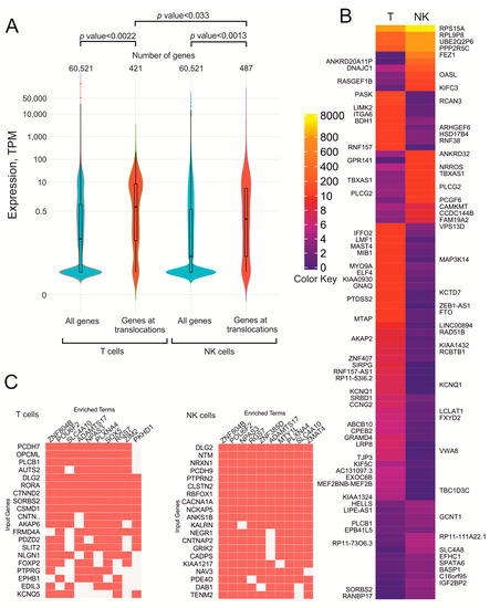 Previously, it was observed that active rDNA units possessing Pleiades often shape inter-chromosomal contacts with the genomic regions also acquiring hot spots of DSBs [5,6]. It was suggested that closely located chromosomal regions that both possess DSBs might give rise to incorrect end-joining and translocation. To determine whether transcribed genes, which may have more DSBs, are more often involved in rDNA-mediated translocation, we compared the expression of all genes and the expression of translocated genes. The violin plots shown in Figure 4A indicate that in both the normal T cells and in normal NK cells, the translocated genes are more actively transcribed than the bulk genes.