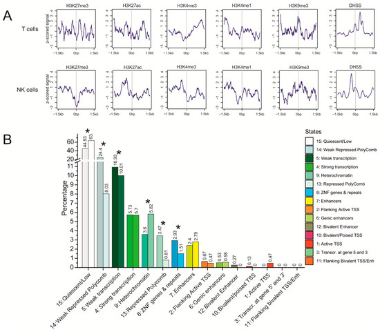 The following genome-wide fold change compared to the control for hg19 profiles were downloaded from the Encode [18] project: for the T cells, H3K27me3 (ENCFF646OPC), H3K27ac (ENCFF491BKU), H3K4me3 (ENCFF692YGS), H3K4me1 (ENCFF376PDM), H3K9me3 (ENCFF331ZNM), and DNase I HSS (ENCFF334YII, ENCFF472QRS); for the NK cells, H3K27me3 (ENCFF269TUJ), H3K27ac (ENCFF238EMY), H3K4me3 (ENCFF428SHV), H3K4me1 (ENCFF204KCP), H3K9me3 (ENCFF292VWV), and DNase I HSS (ENCFF448RXA and ENCFF544OID).