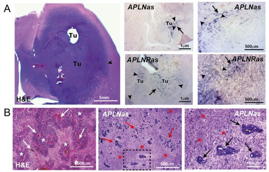 APLN/APLNR upregulation in primary GBM. In situ hybridization (ISH) against APLN or APLNR mRNA was performed on horizontal sections in a GBM implantation model (A) using murine proneural-like p53KOPDGFB GBM cells [42] or in patient primary GBM samples (B). (A) The picture on the left shows the aggressively invasive tumor (Tu) as stained by H&E, the arrowhead points to the invasive tumor border. The pictures on the right indicate APLN or APLNR mRNA (in pink) in tumor vessels (arrows) and tumor cells (arrowheads) using APLN/APLNR antisense ISH probes. (B) Patient biopsies were stained by H&E and APLN ISH was performed on consecutive sections. Note that APLN expression is high in vascular proliferates (arrows) and in the neighboring hypoxic areas of pseudopalisading necroses (asterisks). Micrographs of Figure 1B are adapted from Mastrella et al., 2019 [42]. Scale size is indicated in individual micrographs.
