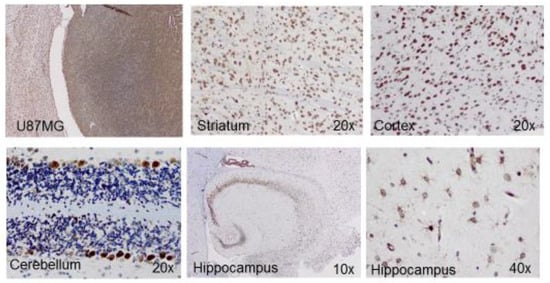APLNR expression in neurons and astrocytes of the GBM-bearing mouse. Expression levels of APLNR in a healthy brain are compared to the immunoreactivity found in U87MG tumor cells. Magnifications and the region of the healthy brain structures are indicated in the individual panels.
