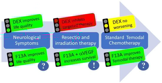 A common feature of primary CNS tumors is the formation of tumor-associated brain edema that will eventually lead to neurological symptoms [110]. Corticosteroids are the most commonly used agents in the management of tumor-associated brain edema [111,112]. Despite the application of the corticosteroid dexamethasone (DEX) for brain edema resolution, clinical attention is now raised on potential side effects including abnormal glucose metabolism, leukopenia, and pneumonia infections [113]. DEX is also applied upon tumor recurrence. Regardless of its obvious effects to alleviate the symptoms from cerebral vasogenic edema, the overall corticosteroid exposure appears to be an independent risk factor for lymphopenia-associated reduction in overall survival [114]. Furthermore, there is evidence that DEX can have cytoprotective effects on glioma cells in vitro [115] and compromise survival in glioblastoma models in vivo [116]. In other tumor entities, the promotion of cancer metastasis by glucocorticoids was also observed [117]. Corticosteroids induce apoptotic cell death in lymphocytes and may have unwanted effects on tumor-associated macrophages or myeloid-derived suppressor cells in GBM [115,118,119]. Edema management with DEX can thus counteract immunotherapies, including chimeric antigen receptor (CAR) T cells, vaccines, and immune checkpoint blockers [120,121,122,123,124]. Out of these reasons, there is a growing need to find alternatives for DEX therapy for edema management in GBM patients [120].
