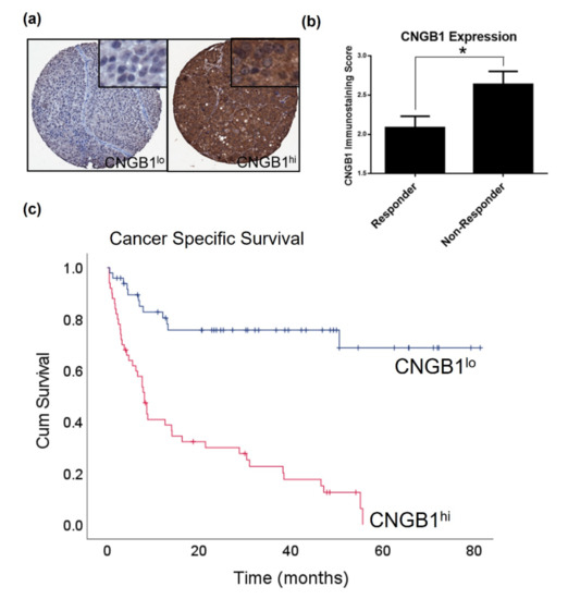 CNGB1 is upregulated in ‘Non-Responders’ to NAC and associates with MIBC patient survival. (a) Examples of low (CNGB1lo) and high (CNGB1hi) levels of CNGB1 expression in MIBC patient tissue cores. (b) Comparison of CNGB1 immunostaining score between ‘Responder’ and ‘Non-Responder’ patients, a protein-based validation of the Discovery cohort (n = 30, t-test, * p < 0.05). (c) Correlation of CNGB1 expression with cancer specific survival by Kaplan-Meier analysis (Validation cohort 2; n = 99, Log rank test, p < 0.001).