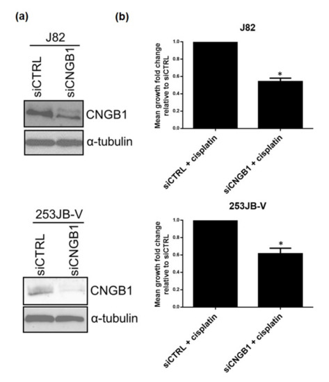 CNGB1 knockdown enhanced cisplatin sensitivity. (a) Confirmation of CNGB1 knockdown in J82 and 253JB-V MIBC cells by western blot analysis. α-tubulin was used as a loading control. (b) The effect of cisplatin, as a proxy for NAC, was assessed on the growth of J82 and 253JB-V cells following knockdown of CNGB1 for 48 h. Mean growth fold change relative to siCTRL was calculated for cisplatin treated cells (n = 3 experimental repeats, t-test, * p < 0.05).