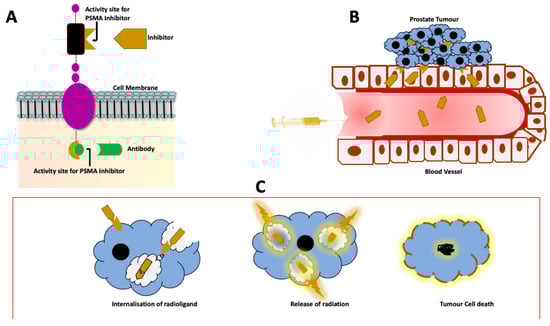 Illustration of theragnostic approach to the management of PCa. (A) The PSMA protein with the different components, namely the intracellular, transmembrane and the extracellular portion. The activity sites on both the intracellular and extracellular domains have been used for binding of monoclonal antibodies, minibodies and small molecules. This enables targeting of the PSMA protein for both imaging and therapy. (B) Once the tracer is injected into the bloodstream, the PSMA ligand binds to the activity site on the tumour cells. (C) After binding to the activity site on the cell membrane, the radioligand is internalized and releases radiation from within the cell. The end product is DNA damage with resultant tumour cell death.