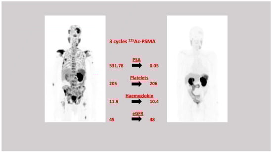 The evidence presented thus far on targeted alpha therapy (TAT) with 225Ac-PSMA in mCRPC patients is in heavily pre-treated patients who have exhausted all treatment options. In seventeen chemotherapy naive men with mCRPC, Sathekge et al. demonstrated an impressive response to 225Ac-PSMA-617 with 70% of these patients having a ≥80% decline in serum PSA after a single cycle of therapy and 82% of patients having a ≥90% decline in serum PSA level at the end of treatment. Only three patients had a rise in the serum PSA, however one of these patients went on to eventually have a serum PSA decline of 74% by the end of treatment, while the other patient progressed despite having received three cycles of therapy and subsequently received no further treatment. After a median follow-up of 13 months, just over 40% of the patients had remained in remission. While this follow-up period is limited especially for monitoring long-term responses and toxicities, the outcome in these patients is still quite impressive considering that progression free survival with some of the chemotherapeutic drugs is only up to 4.8 months [109]. Figure 3. An image of a chemo-naïve patient with a remarkable response to targeted alpha therapy with 225Ac-PSMA. This study presents evidence that supports the early introduction of TAT in the therapeutic schema of mCRPC. There is a need for phase 3 clinical trials to better define the timing of the application of 225Ac-PSMA in the treatment sequence of mCRPC. In a larger series of >70 patients, this group went on to confirm these findings of an excellent biochemical and imaging response in heavily patients with mCRPC who had failed other conventional therapies. In this study, 70% of patients had a PSA decline of ≥50% and this was the single most significant predictor of overall survival with an OS of 20.1 months for patients with serum PSA decline of ≥50% after the first treatment cycle and 10.5 months for those with a <50% decline in serum PSA level [110]. They also found that previous treatment with 177Lu-PSMA was associated with a shorter progression-free survival suggesting that prior therapy with this beta emitter may induce resistance to radiation [110].