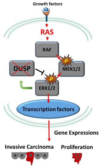 - Furukawa, T.; Sunamura, M.; Motoi, F.; Matsuno, S.; Horii, A. Potential tumor suppressive pathway involving DUSP6/MKP-3 in pancreatic cancer. Am. J. Pathol. 2003, 162, 1807–1815. [Google Scholar] [CrossRef] [Green Version]