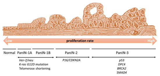 Additional loss of p53 and Smad4 functions will accelerate disease progression, and tumors become high-grade PanIN-3 lesions [7,19,20]. Finally, additional inactivation of DUSP6 results in advanced pancreatic ductal adenocarcinoma [16,17]. In this case, TSGs were found to help cellular DNA-repair homeostasis, control cell division, and induce apoptosis. p53, Smad4, p16, Brca1/2, and PTEN are common examples of TSGs that are involved in PDAC carcinogenesis [10,11,12,21,22,23] (Figure 2).