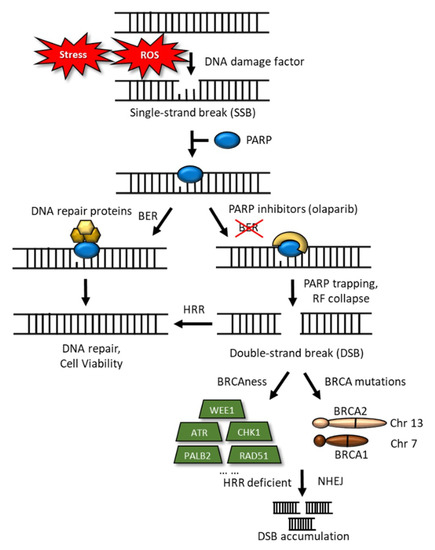 Schematic representation of DNA damage and DNA-double-strand breaks. DNA-damage inducers, such as stress and ROS, sometimes trigger single-strand breaks (SSBs), to which PARP binds, for their repair. Base excision repair (BER) reverses the DNA damage resulting from oxidation, deamination, and alkylation. In this case, BER DNA glycosylase recognizes and removes the damaged base, leaving an abasic site that is processed further, by short-patch or long-patch repair, which largely uses different proteins to complete BER. PARP inhibitors trap the PARP-1 protein at an SSB/DNA lesion and disrupt its catalytic cycle, this would ultimately lead to replication fork progression and consequent double-strand breaks (DSBs). In the case of BRCA mutations, loss of HRR would result in cell death. HRR deficient and nonhomologous end-joining lead to the accumulation of DSBs.