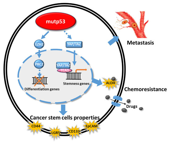 Schematic representation of the effects of mutp53 on cancer-stem-cell–related genes and chemoresistance function. Mutp53 induces EZH2 to block the function of differentiation genes and triggers YAP/TAZ signaling to upregulate stemness genes, which are induced to chemoresistance-related genes. Mutp53 also induces the cancer stem cell related genes, such as CD44, LGR5, CD133, and EpCAM, which might induce the metastasis and cancer progression.