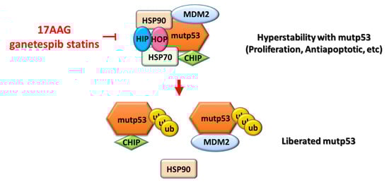 Mutant p53 genes are pro-oncogenic drivers [73,74,75], and cancer cells rely on these oncogenes for survival or growth [76]. Reducing mutp53 protein stability leads to their degradation, which in turn leads to cancer cell death. Heat-shock proteins, such as HSP70 and HSP90, can bind to mutp53 proteins to form a chaperone complex. This complex can inactivate endogenous MDM2 and the carboxy terminus of the HSP70-interacting protein (CHIP), resulting in mutp53 protein accumulation in human cancer cells. The pharmacological inhibitor 17-allylamino-17-demethoxygeldanamycin (17AAG) can destroy this chaperone complex, liberate mutp53 proteins, and reactivate endogenous MDM2 and CHIP, to degrade mutp53 proteins [77] (Figure 5).