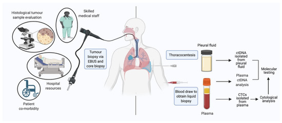 Unfortunately, a significant proportion of people present with advanced disease (stage III/IV) and surgery may not be indicated [6]. In such cases, the only tissue that may be available for molecular testing are small needle core biopsies or cytology specimens, which is not always sufficient due to lack of tumor material. This would necessitate a further re-biopsy, which carries an 8.4% complication risk [7] and overall major complications rate of 5.7% for CT-guided core biopsies and 4.4% for FNA-based biopsies [8]. Furthermore, biopsies in many LCa cases are not feasible outright or at re-biopsy due to tumor location or performance status [9].