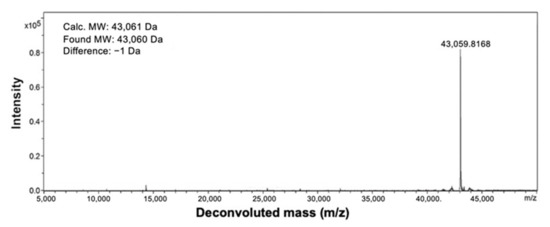 The Ec1-LoPE fusion protein was produced in E. coli as described by Shramova et al. [54]. Analysis by mass spectroscopy showed a protein with a molecular weight of 43,060 Da, which was within 1 Da of the expected molecular weight (43,061 Da) (Figure 1).