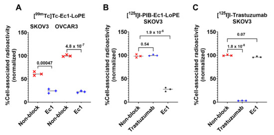 In vitro binding specificity of (A) [99mTc]Tc-labeled Ec1-LoPE in SKOV3 and OVCAR3 cells expressing EpCAM; Symbols (×) show individual measured values for binding to non-blocked cells, and symbols (+) measured values for binding to blocked cells. (B) cross-blocking study of [125I]I-labeled Ec1-LoPE; and (C) [125I]I-labeled trastuzumab in EpCAM- and HER2-expressing SKOV3 cells. For blocking, a 100-fold molar excess of anti-EpCAM DARPin Ec1 or anti-HER2 antibody trastuzumab was added to blocked groups. The final concentration of radiolabeled compound was 2 nM. The data are presented as average ± SD (n = 3). p-values from unpaired t-test (equal variation) are provided to characterize differences between activity uptake in blocked and non-blocked groups. Symbols (×) show individual measured values for binding to non-blocked cells, symbols (+) measured values for binding to cells blocked with trastuzumab, and symbols (★) measured values for binding to cells blocked with Ec1.
